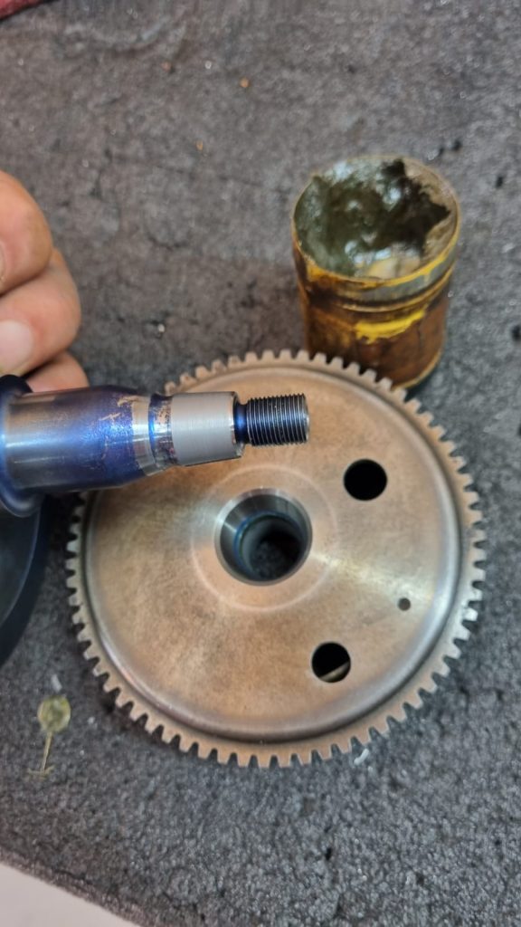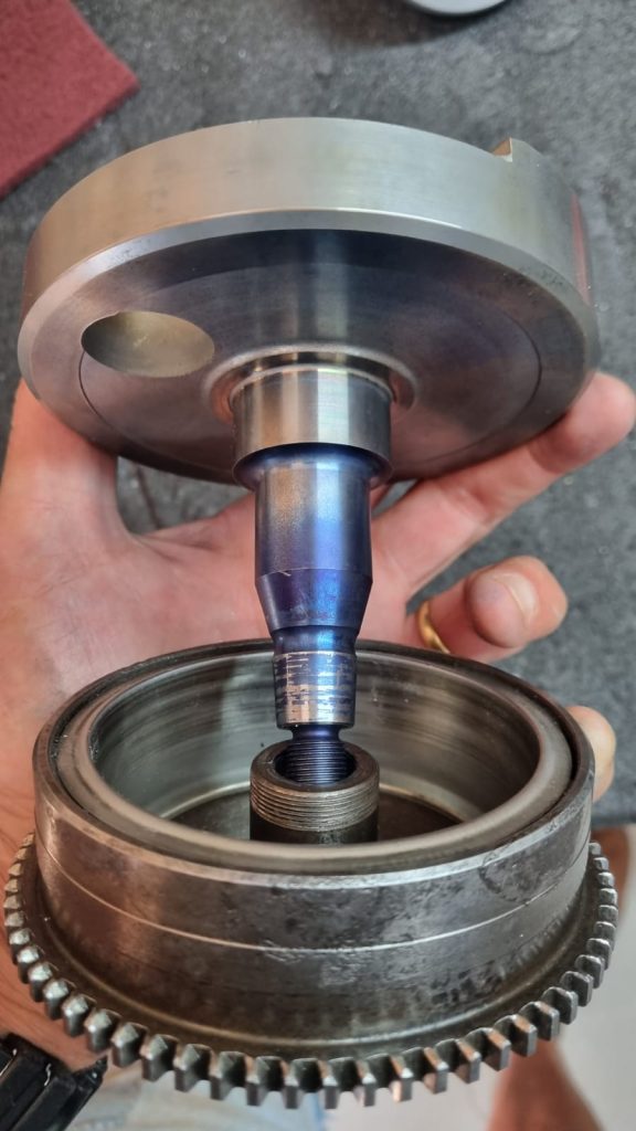 The crank was built thanks to the amazing engineering work done by P&C Technologies! The first image shows the great match of the ignition rotor to crank taper using mechanics blue! The second image shows the taper after I lapped it with fine valve grinding paste, it does not come better than this! The last image shows the crank between centres to check runout, we managed to get it to total runout of only 0.03mm after a couple of minutes, great stuff for such a whopping big crank👊🏻‼