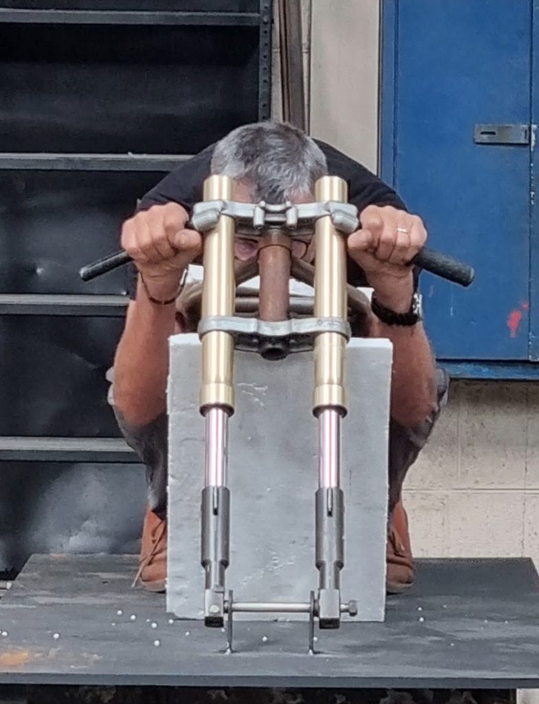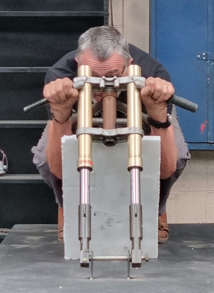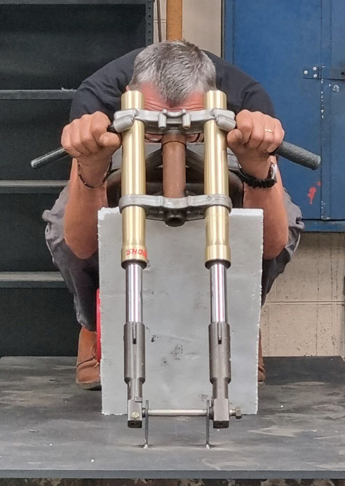 This is riding position 1, feet tucked in (I wear size 14 UK boots so it’s important!) and I’m squinting over the triple clamps. The forks are pushed up as far as possible to lower overall height but leaving just enough space for the front wheel not to touch the bottom triple clamp at full bump.