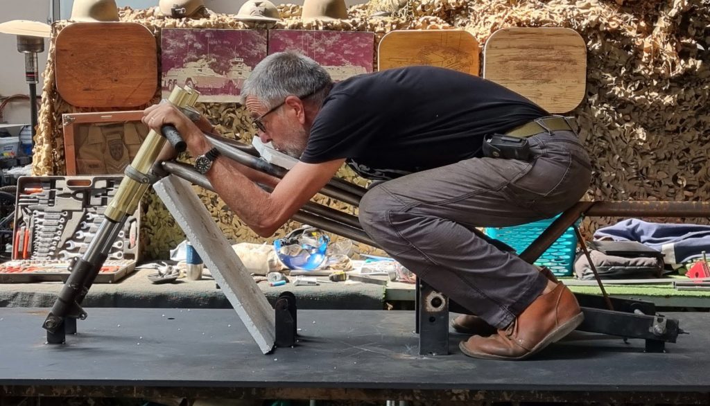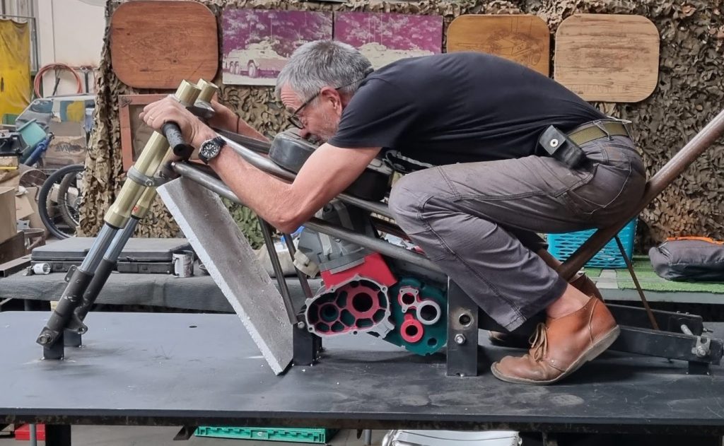 After thinking about the prone riding position a lot, we decided to do something more conventional, the next pictures date back to July. The main reason for abandoning the prone concept was that I am a bike racer and I need to ride in a position that I’m accustomed to so that I have a better chance of controlling the bike when the ruts in the salt pan throw me a curve ball! It should be noted here that the last time I rode a bike in anger was 33 years ago, virtually nothing in between…..
