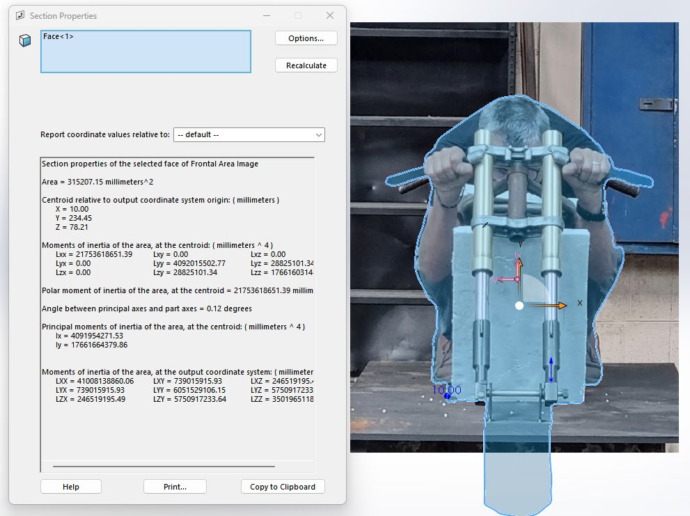 Jock used the final picture to calculate total frontal area on CAD which we plugged then plugged into the simulation program to calculate top speed. The great news is that this area is substantially smaller than what I have used until now and our top speed jumped up by 20 km/h just because of this more accurate and smaller figure!